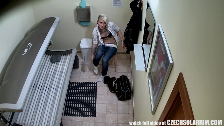 Рабочие одного элитного солярия установили скрытые камеры видео наблюдения, которые зафиксировали очаровательную красотку с татуировками и пирсингом.