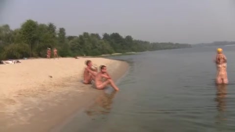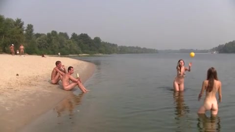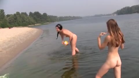 Описание: Молоденькие сучки разделись до гола на пляже и играют в воде в мячик.