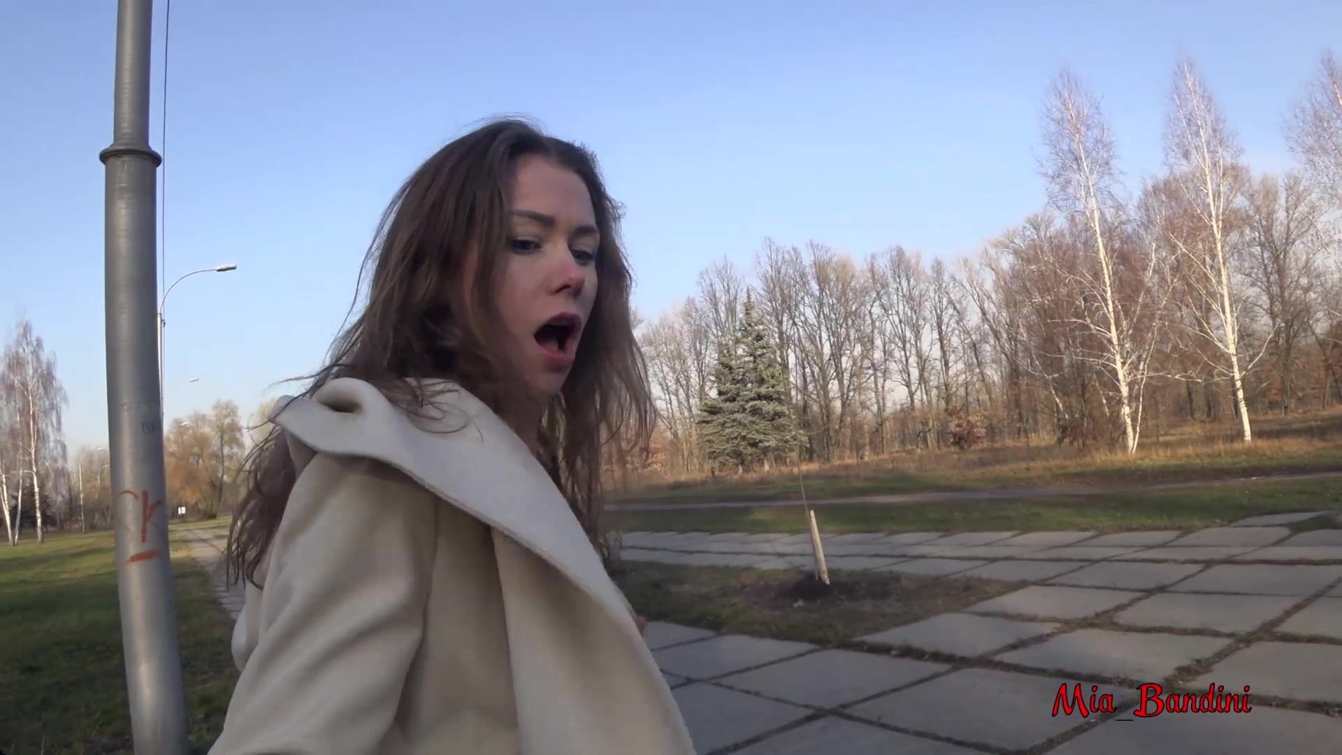 Миа Бандини решила развеяться на свежем воздухе в городском парке вместе со своим парнем. Во дворе стояла осень, все деревья уже сбросили листья, похолодало, но между ног красотки все так же горячо и она сделала приятный сюрприз бойфренду одев легкое пальто просто на голое тело. Гуляй душа, веселись пока молодая! Милашка танцует с расстегнутыми пуговицами, а из под пальтишка торчат упругие красивые сиськи. Веселая сучка становится раком и показывает домашнему оператору свою попу, после чего принимается сосать его член... Еще один погожий денек удался на славу!